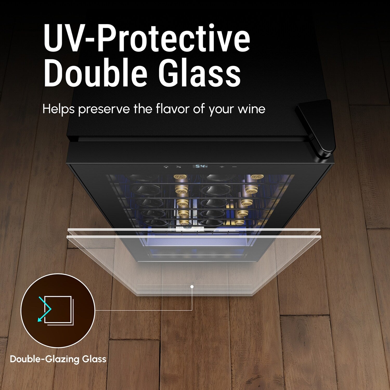 Préservez la qualité de votre vin grâce à notre porte vitrée double vitrage à protection UV. Cette caractéristique bloque les rayons UV nocifs, garantissant que votre vin conserve son goût et son arôme parfaits.